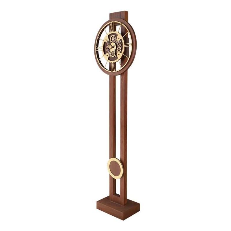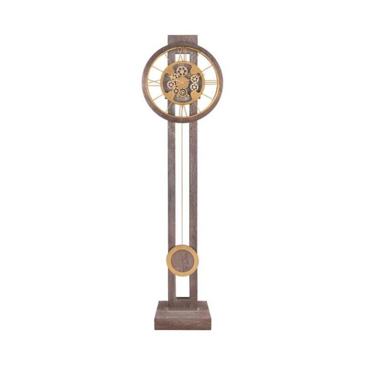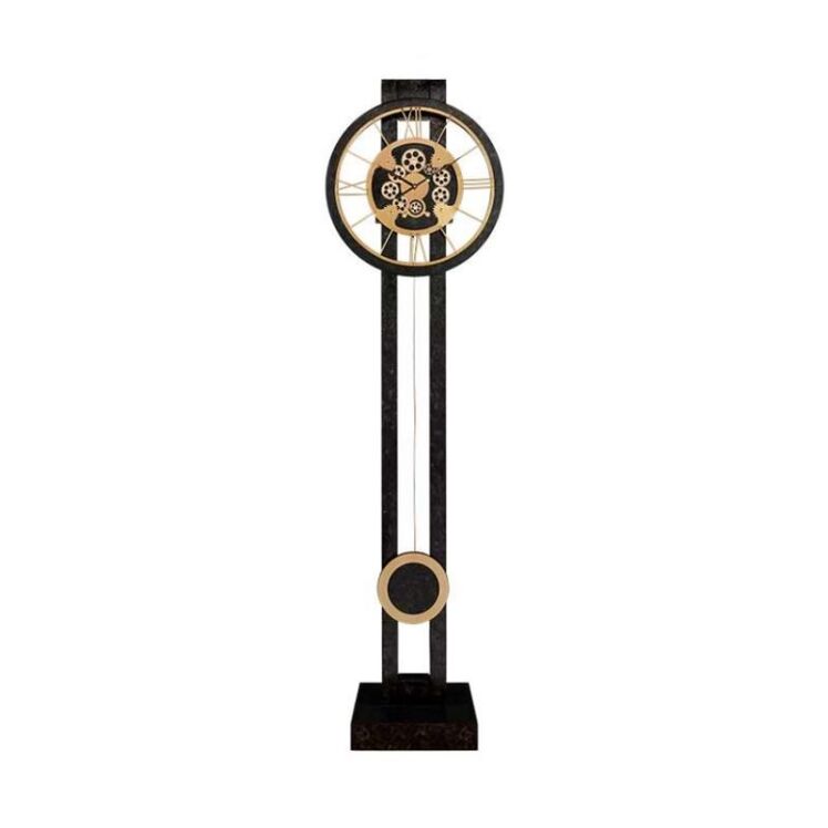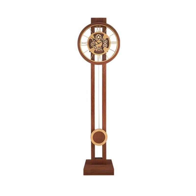 در بخش بالایی ساعت، صفحهی گرد با چرخدندهی متحرک قرار دارد که جلوهای پویا و متفاوت ایجاد میکند. پاندول طلایی در قسمت پایین، حرکت نرم و مداومی دارد و حالوهوای فضا را زندهتر میکند. این ترکیب جذاب باعث شده این مدل برای دکوراسیون سالن پذیرایی، لابی هتل، نشیمن، دفاتر شیک و فضاهای تجاری بسیار ایدهآل باشد.
