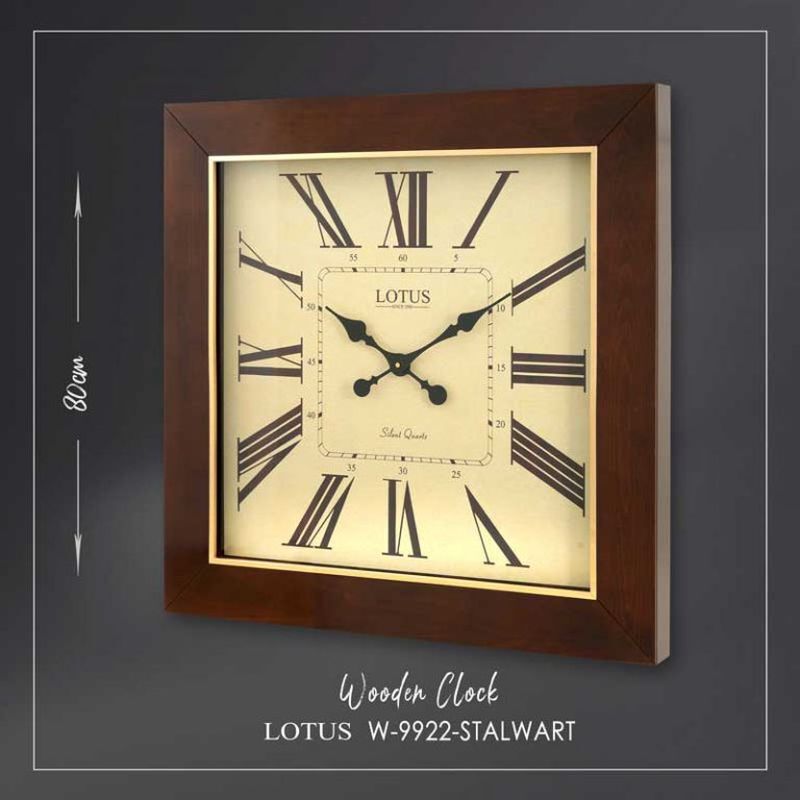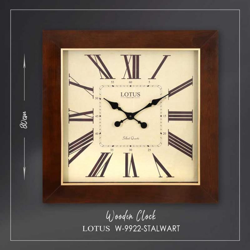 ساعت دیواری چوبی استالوارت لوتوس LOTUS مدل W-9922-STALWART، یکی از مدلهای مربع زیبا و سایز بزرگ از برند لوتوس است که با طراحی چشمگیر و فریم قهوه ای خود، جلوهای متفاوت و بهروز به دکوراسیون شما میبخشد. طراحی ساده یونانی صفحه باعث شده ظاهری جذاب داشته باشد و به مروز زمان تکراری نشود . سایز بزرگ 80 سانتی متری این ساعت باعث شده که این ساعت همانند یک اکسسوری جذاب در دیوار دکوراسیون شما بدرخشد.