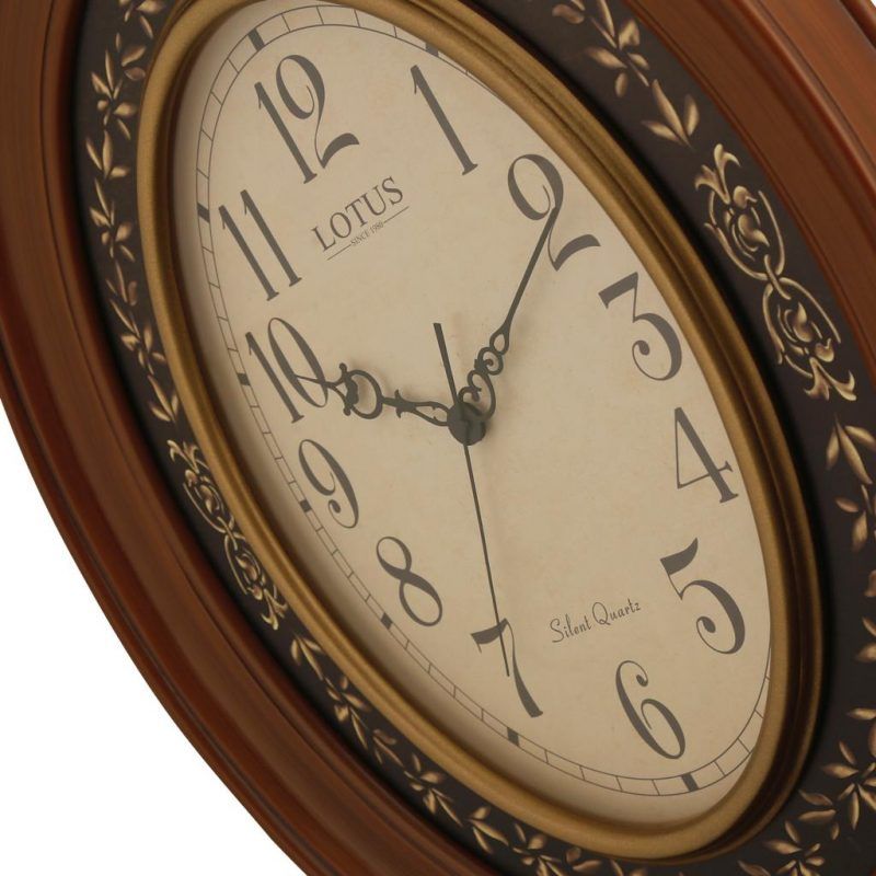 ساعت دیواری چوبی کالوین LOTUS لوتوس L007-CALVIN،با طراحی بیضیشکل و بهرهگیری از دو فریم چوبی، جلوهای منحصربهفرد و نئوکلاسیک دارد . هارمونی جذاب میان رنگ روشن صفحه و فریمهای قهوه ای و طلایی ساعت ، این مدل را به انتخابی ایدهآل برای علاقه مندان به ساعت تبدیل میکند.