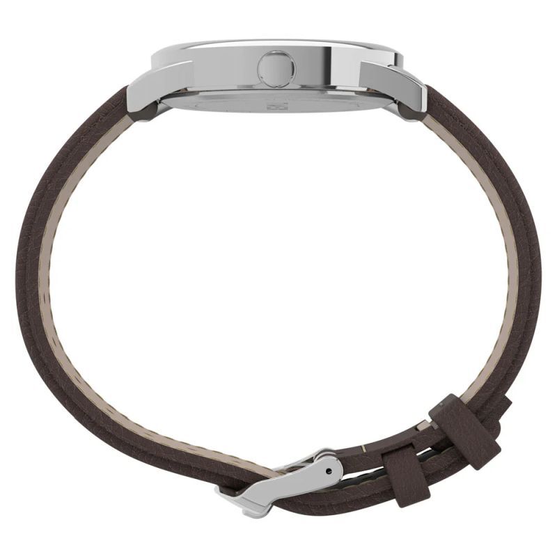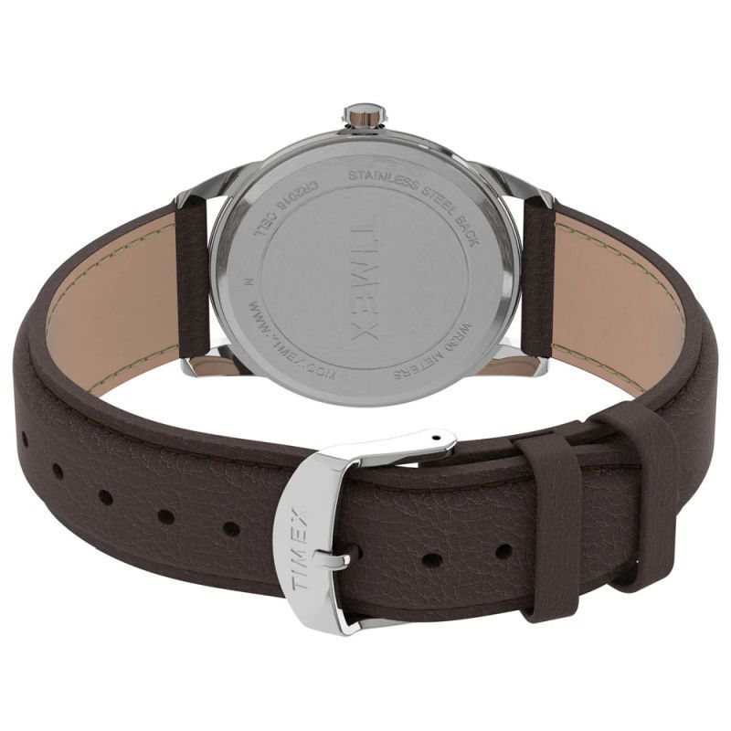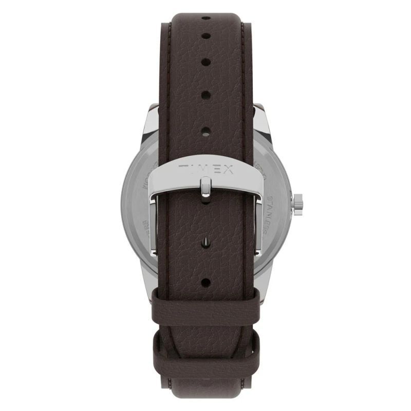 بند چرمی اصل با عرض ۲۰ میلیمتر و قابلیت تنظیم برای مچهایی تا اندازهی ۸ اینچ طراحی شده است. این ساعت Timex مردانه دارای صفحهی بزرگ و خوانا است که زمان را با وضوح بالا نمایش میدهد.