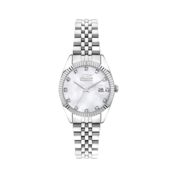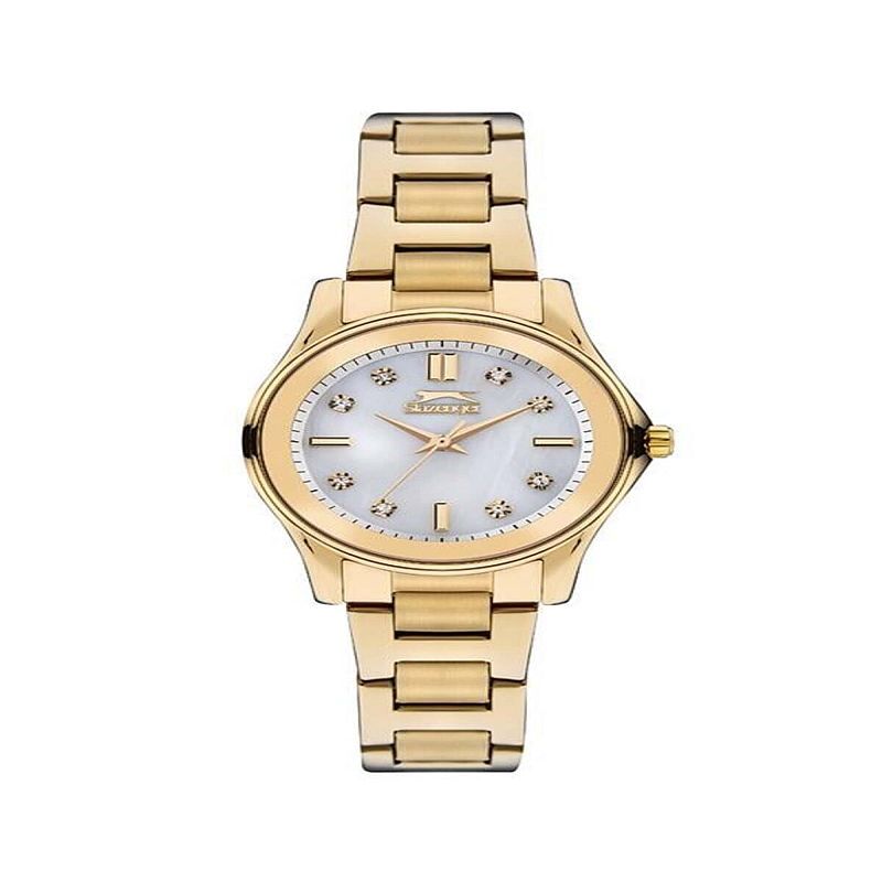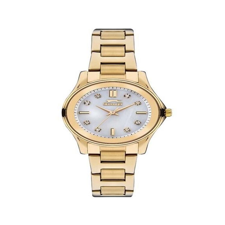 ساعت مچی اسلازنجر SLAZENGERمدل SL.09.2235.3.06 ،یک ساعت زنانه طلایی باصفحه خاص است . ساعت از استیل (Stainless Steel) ساخته شده و رنگ طلایی براق آن جلوهای خاص به مچ دست شما میدهد. صفحهی صدفی با نشانگر های نگینی، ظاهری کلاسیک و چشمگیر ایجاد کرده است. شیشهی معدنی مقاوم در برابر خط و خش نیز از صفحه محافظت میکند تا ساعت شما همیشه نو و درخشان بماند.
