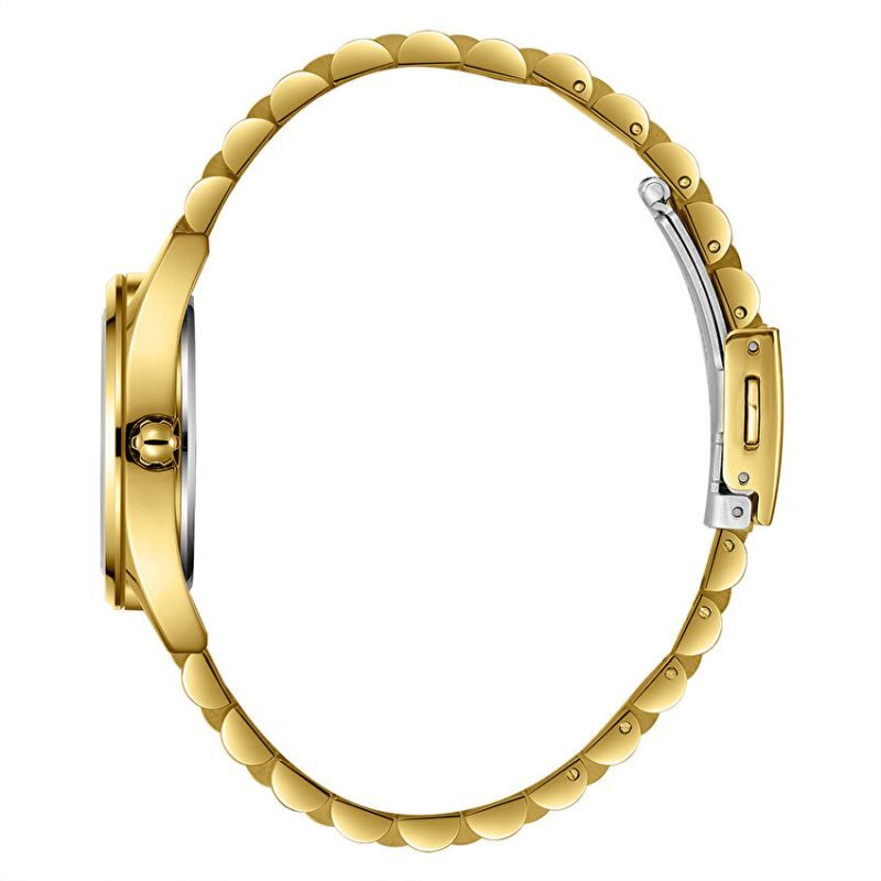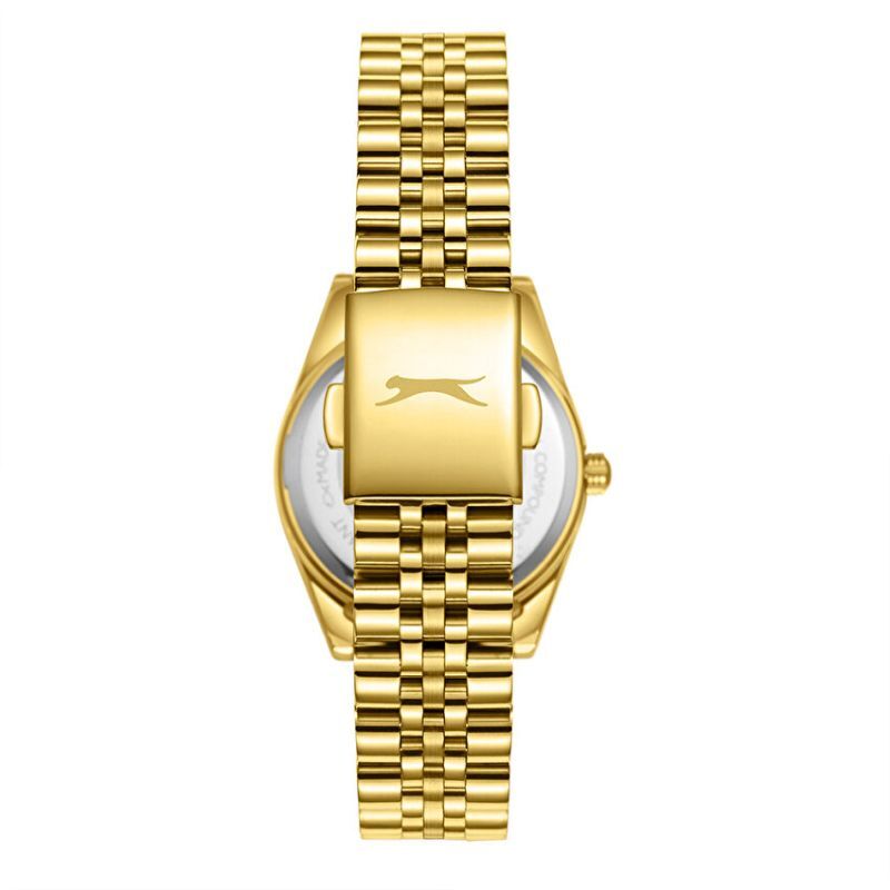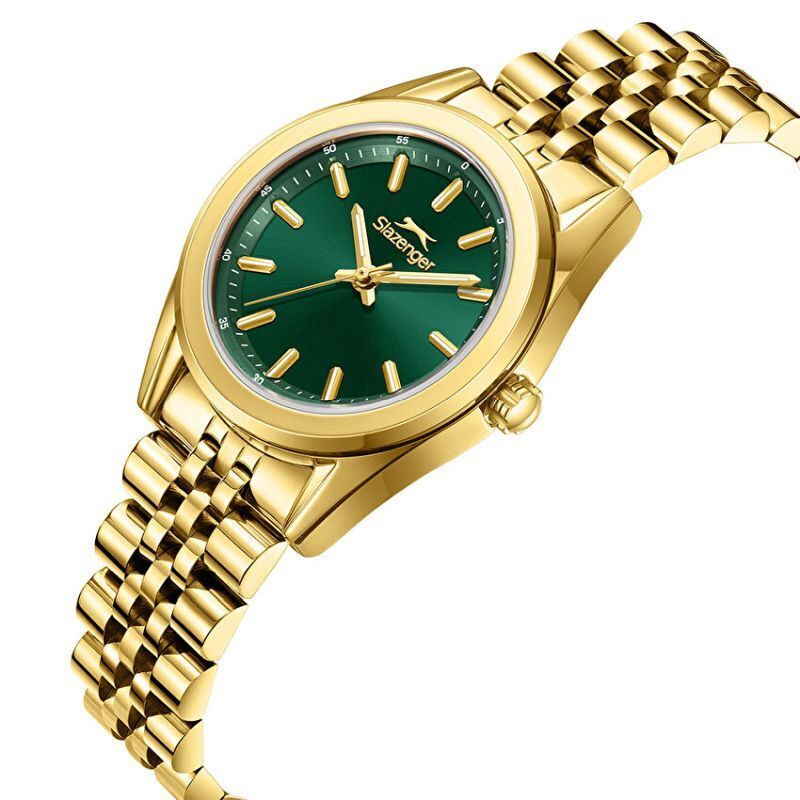 ساعت مچی اسلازنجر SLAZENGERمدل SL.09.2463.3.05 ،یک ساعت زنانه طلایی خاص باصفحه سبز رنگ است . ساعت از استیل (Stainless Steel) ساخته شده و رنگ طلایی آن جلوهای خاص دارد. صفحه سبز با نشانگر های طلایی ظاهری چشمگیر ایجاد کرده است. شیشهی معدنی مقاوم در برابر خط و خش نیز از صفحه محافظت میکند تا ساعت شما همیشه نو و درخشان بماند.
