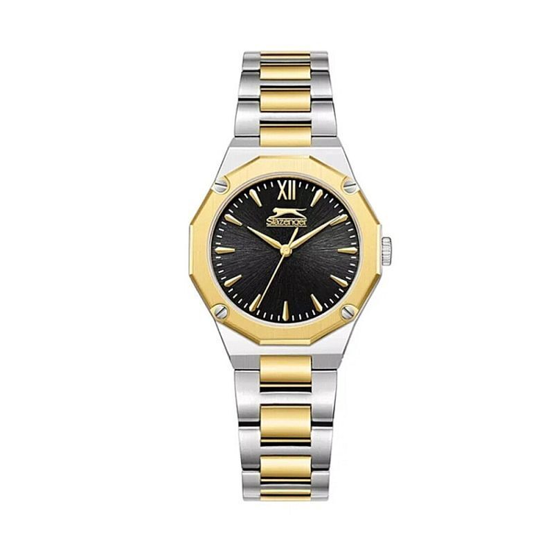 ساعت مچی اسلازنجر SLAZENGERمدل SL.09.2301.3.02 ،یک ساعت خاص زنانه با قاب چند ضلعی چشمگیر است. ساعت از استیل دو رنگ سیلور - طلایی ساخته شده که جلوهای خاص به مچ دست شما میدهد. صفحهی کلاسیک ساده مشکی با نشانگر های خطی طلایی ، ظاهری کلاسیک و چشمگیر ایجاد کرده است. شیشهی معدنی مقاوم در برابر خط و خش نیز از صفحه محافظت میکند تا ساعت شما همیشه نو و درخشان بماند.